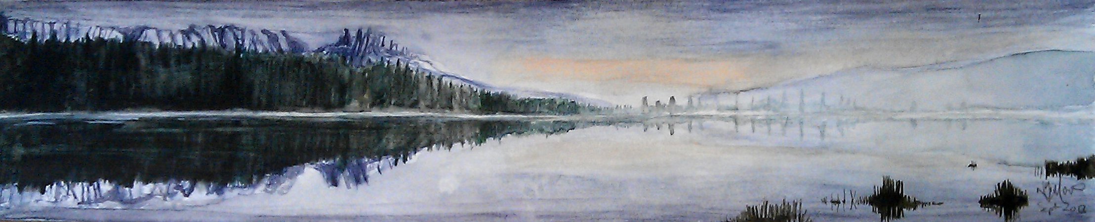 Anyhow this weeks painting is an extended landscape – Lake Side. Oh and some of the reflections don’t fully match, the paper is curled in the corner when I took the picture!